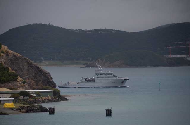 Après plus d'une heure de parade nautique, le D’Entrecasteaux, bâtiment multimissions de la marine (B2M, pour les intimes) a fait son arrivée inaugurale à son port d’attache de Nouméa, à 11 heures ce matin.