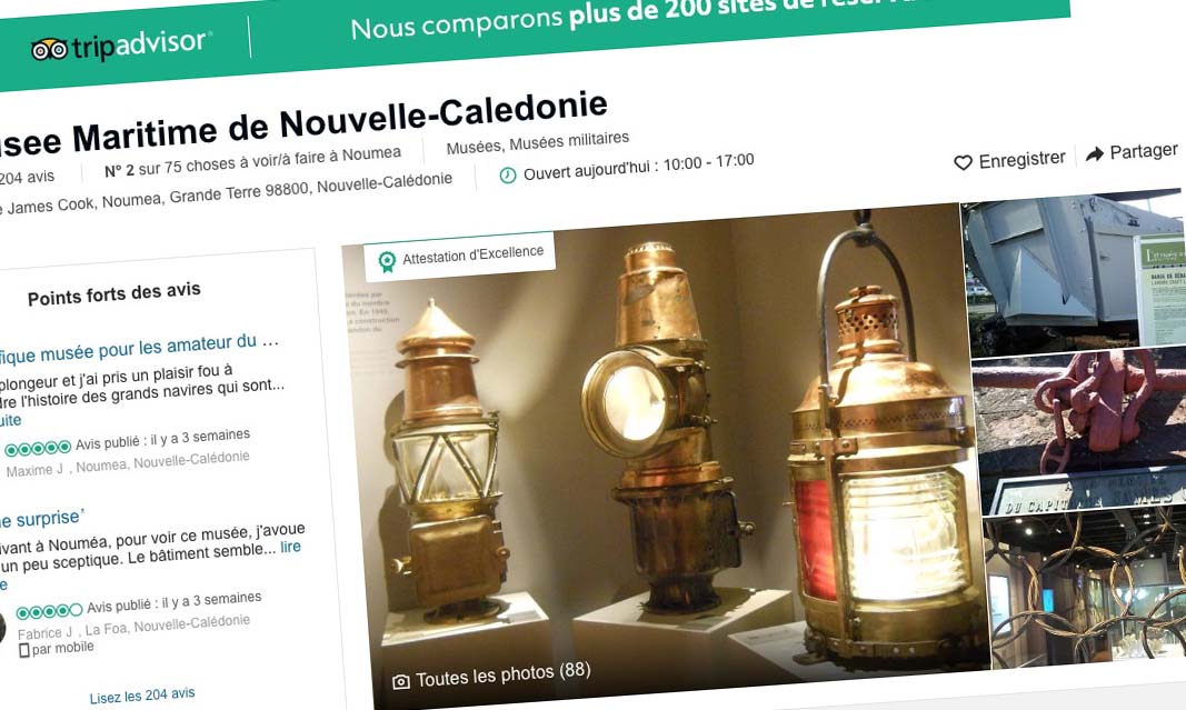 L'équipe du Musée maritime de Nouvelle-Calédonie s'est félicitée, hier, du fait que le lieu était devenue la deuxième activité à faire à Nouméa sur le site TripAdvisor, qui regroupe les avis et les conseils de voyageurs. « Certains ont 2 étoiles à leur maillot.... et nous, nous sommes 2ème !!! », peut-on lire sur la page Facebook du Musée maritime.