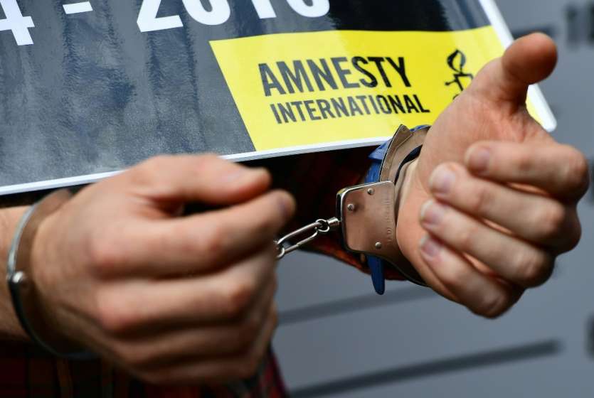 - © 2019 AFP | Crée le 10.04.2019 à 16h51 | Mis à jour le 10.04.2019 à 16h55ImprimerUn membre d'Amnesty International tient une pancarte lors d'une manifestation devant l'ambassade turque à Bruxelles le 15 juin 2017 EMMANUEL DUNAND-AFP