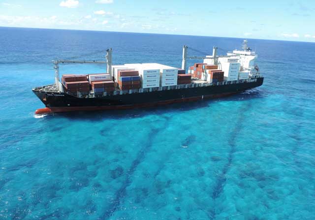 En première analyse, le porte-conteneur est entièrement échoué sur le récif, mais la situation est stable. Aucun polluant n’a été détecté à ce stade et l’équipage reste en sécurité à bord.