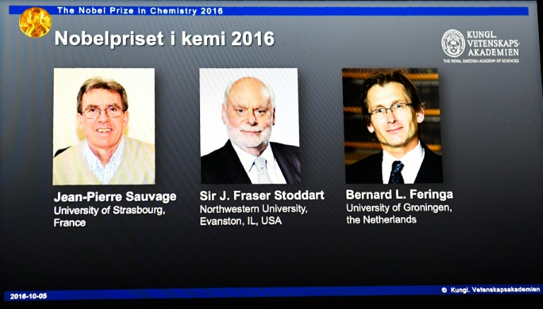 - © 2016 AFP | Crée le 05.10.2016 à 20h58 | Mis à jour le 05.10.2016 à 21h00Imprimer(g-d) les photos de Jean-Pierre Sauvage, J. Fraser Stoddart et Bernard L. Feringa, lauréats du prix Nobel de chimie, le 5 octobre 2016 à Stockholm