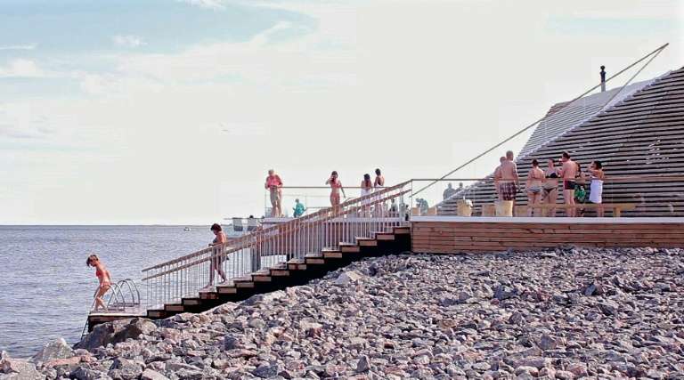 Dans la capitale Helsinki, c'est le lieu tendance de l'été et il attire des Finlandais de tous les âges venus évacuer à 80°C ou plus le stress par tous les pores de la peau, dans des locaux au design impeccable au bord de l'eau.