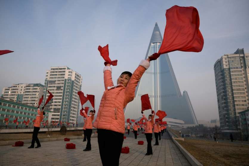 - © 2019 AFP | Crée le 10.03.2019 à 16h12 | Mis à jour le 10.03.2019 à 16h15ImprimerDes Nord-Coréennes effectuent des chorégraphies chaque matin dans le but d'inciter les passants à faire davantage d'efforts au travail, ici le 9 mars 2019 à Pyongyang Ed JONES-AFP