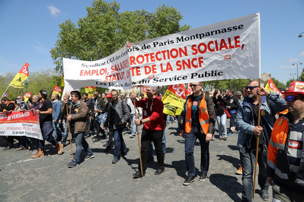 - © 2018 AFP | Crée le 03.05.2018 à 23h37 | Mis à jour le 03.05.2018 à 23h40ImprimerDes employés de la SNCF rassemblés à l'appel de plusieurs syndicats manifestent devant l'Ecole militaire, le 3 mai 2018 à Paris JACQUES DEMARTHON-AFP
