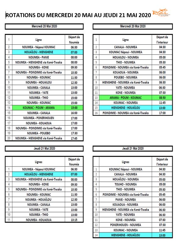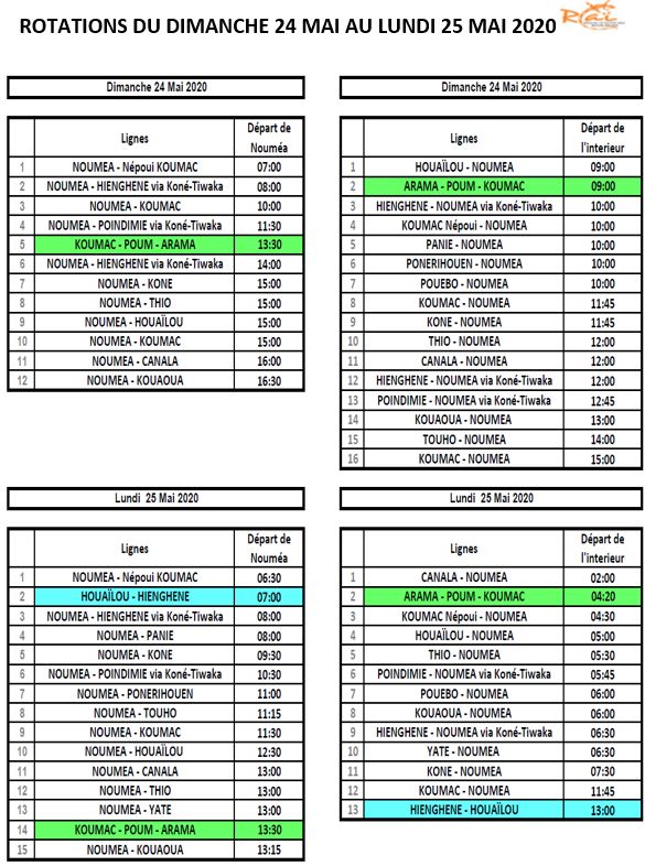 Le réseau de bus vient de diffuser le programme des rotations - entre Nouméa et la Brousse - pour demain, mercredi 20 mai, ainsi que pour les jeudi 21 (ascension), dimanche 24 et lundi 25 mai.