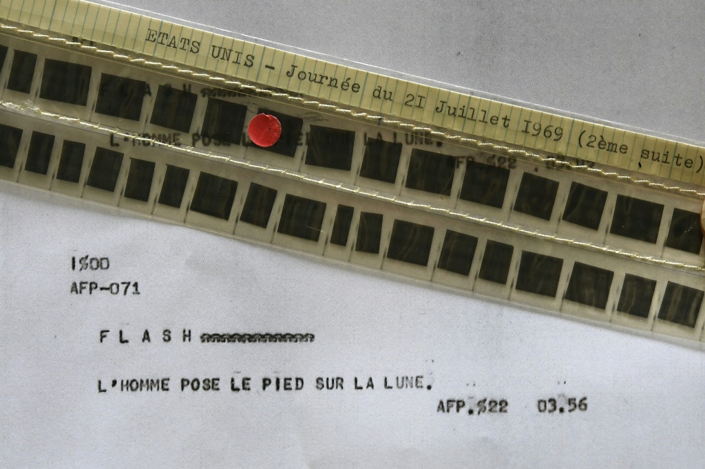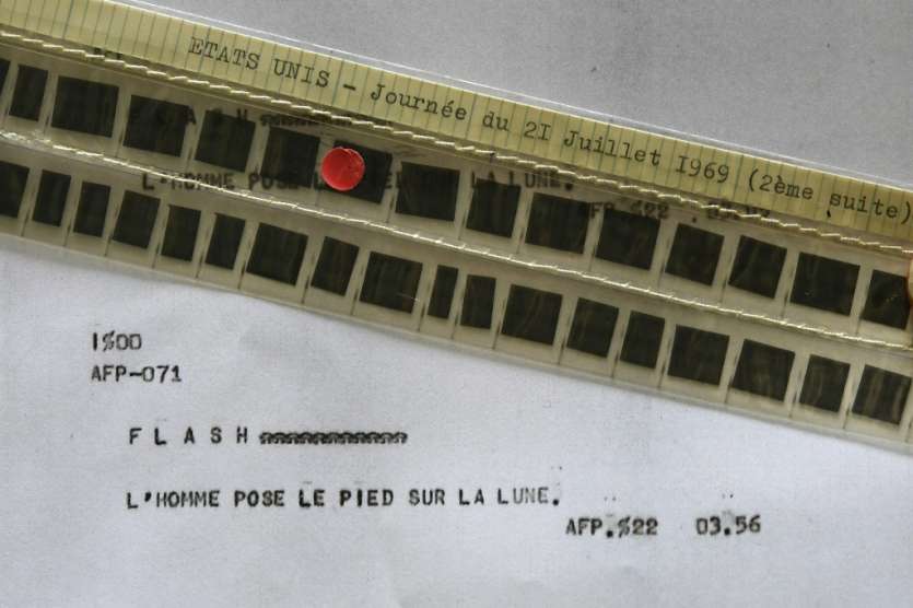 - © 2019 AFP | Crée le 17.06.2019 à 17h02 | Mis à jour le 17.06.2019 à 17h05ImprimerPhoto, prise le 24 mai 2019, du flash de l'AFP annonçant le premier pas de l'homme sur la Lune, publié le 21 juillet 1969 à 02H56 GMT et conservé sur microfilm Anne-Christine POUJOULAT-AFP