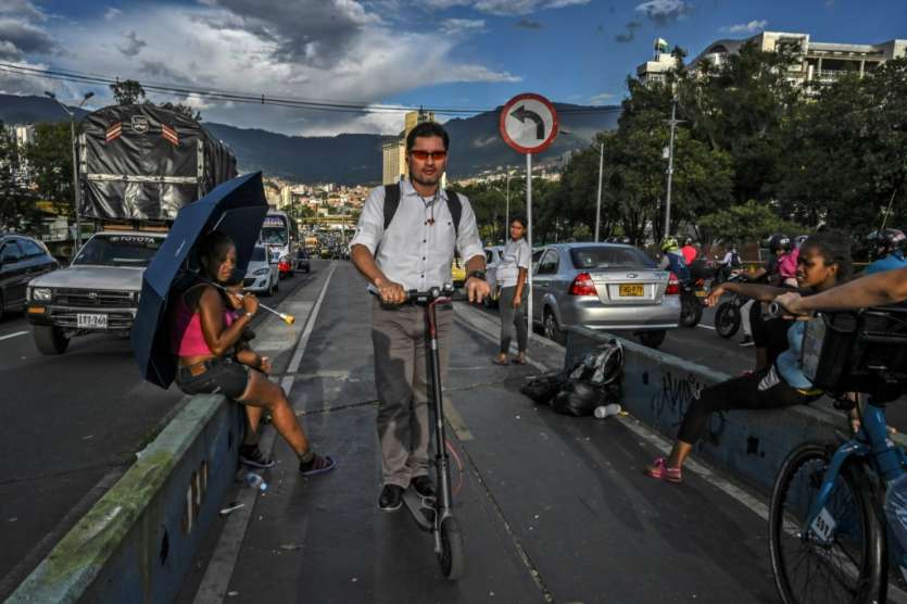 - © 2019 AFP | Crée le 05.07.2019 à 23h32 | Mis à jour le 05.07.2019 à 23h35ImprimerUn homme file sur une trottinette électrique dans les rues de Medellin en Colombie, le 2 juillet 2019 JOAQUIN SARMIENTO-AFP