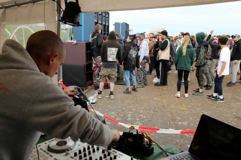 Des dizaines de sound system, des murs d'enceintes de plusieurs mètres de haut, ont été installés sur cette longue bande de bitume entourée de champs. Devant les enceintes, des centaines de jeunes dansent au son de la techno. D'autres sont assis entre des camions et voitures venus de toutes la France et garés en tout sens. Certaines plaques d'immatriculation sont cachées. Des dealers proposent des "taz" (de l'ecstasy, ndlr) ou de la cocaïne.