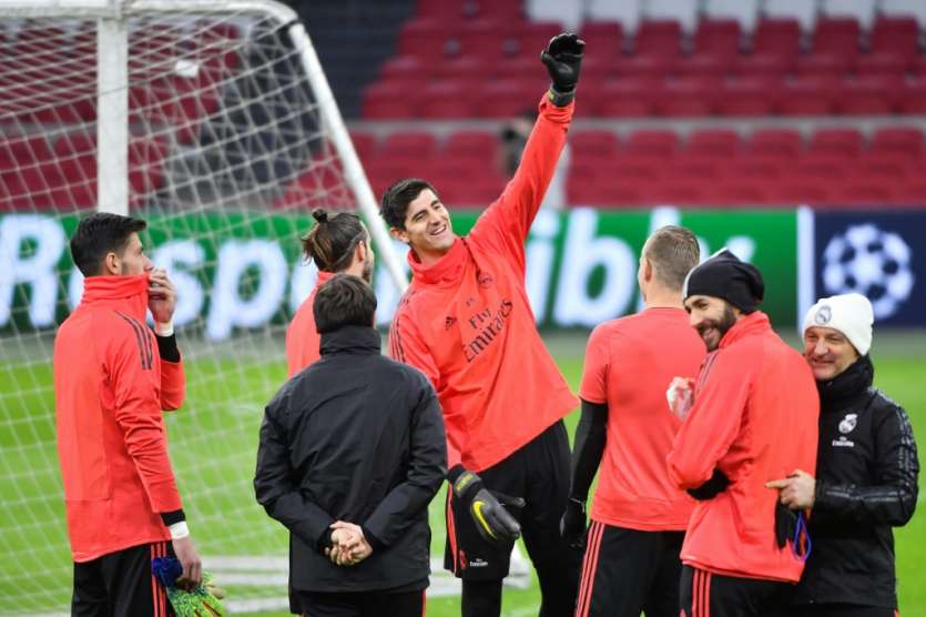 - © 2019 AFP | Crée le 14.02.2019 à 00h49 | Mis à jour le 14.02.2019 à 00h55ImprimerLe gardien du Real Madrid Thibaut Courtois (c) entouré de ses coéquipiers lors d'une séance d'entraînement, le 12 février 2019 à Amsterdam EMMANUEL DUNAND-AFP