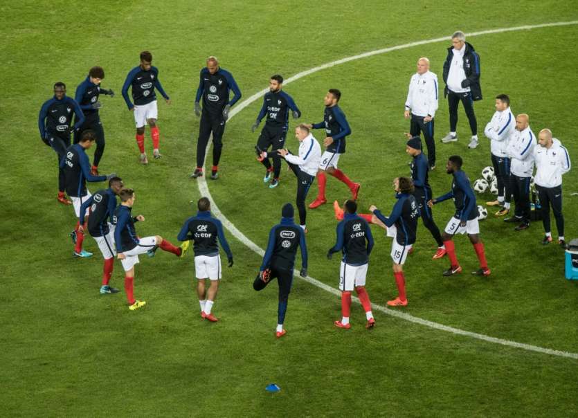 - © 2018 AFP | Crée le 24.01.2018 à 23h43 | Mis à jour le 24.01.2018 à 23h45ImprimerL'équipe de France à l'échauffement avant d'affronter l'Allemagne en match amical à Cologne, le 14 novembre 2017 Bernd Thissen-DPA/AFP/Archives