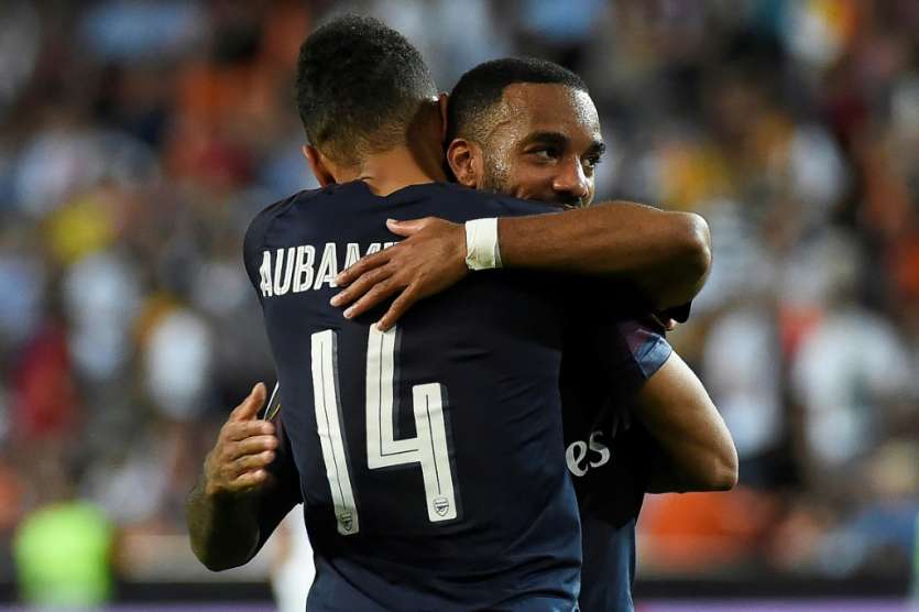 - © 2019 AFP | Crée le 10.05.2019 à 09h13 | Mis à jour le 10.05.2019 à 09h15ImprimerLes buteurs d'Arsenal Pierre-Emerick Aubameyang et Alexandre Lacazette après la qualification de leur équipe en finale de Ligue Europa en éliminant Valence, le 9 mai 2019 à Mestalla JOSE JORDAN-AFP