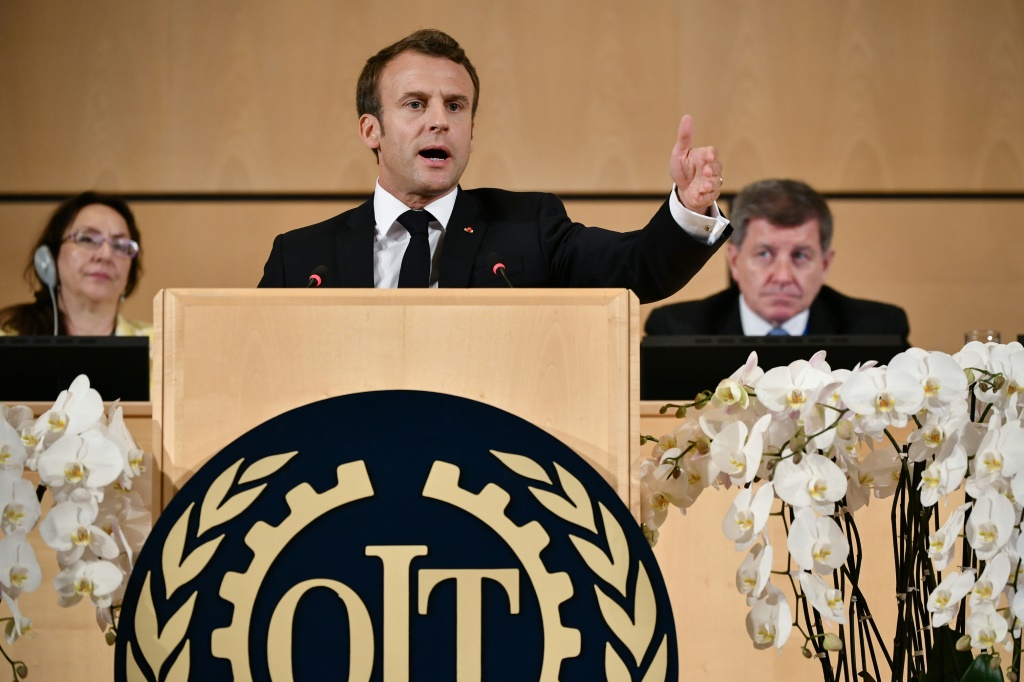 - © 2019 AFP | Crée le 12.06.2019 à 01h24 | Mis à jour le 12.06.2019 à 01h30ImprimerEmmanuel Macron prononce un discours devant l'Organisation internationale du travail à Genève, le 11 juin 2019 FABRICE COFFRINI-AFP