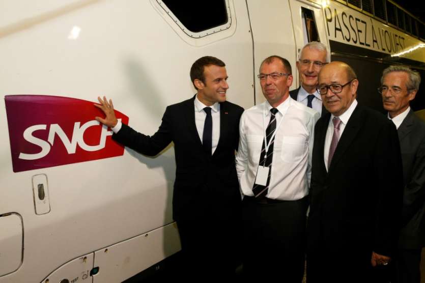 - © 2017 AFP | Crée le 07.09.2017 à 02h21 | Mis à jour le 07.09.2017 à 02h25ImprimerLe président de la République Emmanuel Macron (g), accompagné notamment du patron de la SNCF Guillaume Pepy (c., arrière-plan) et du ministre des Affaires étrangères Jean-Yves Le Drian (2e à d.) le 1er juillet 2017 à la gare Montparnasse à Paris GEOFFROY VAN DER HASSELT-AFP/Archives