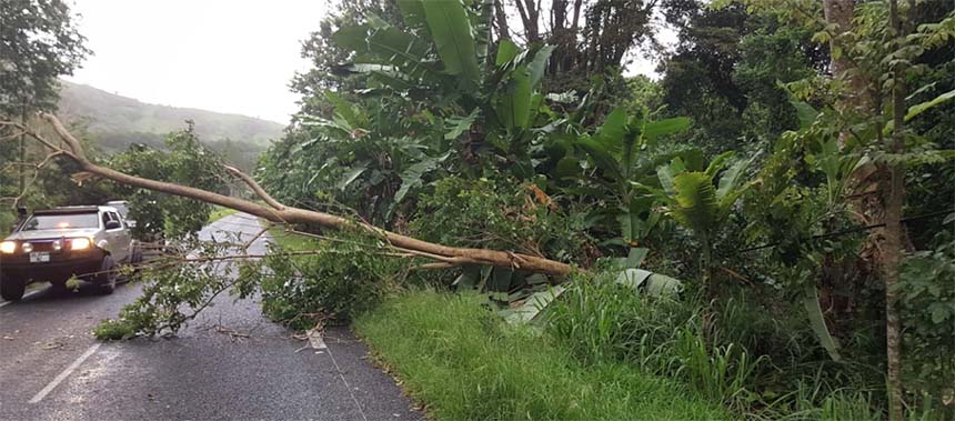 Sur la route, entre Hienghène et Touho, un arbre est tombé et bloque la moitié de la chaussée.