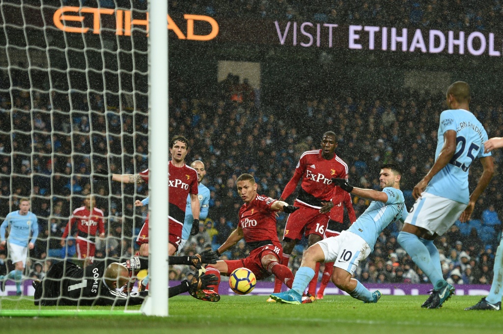 - © 2018 AFP | Crée le 03.01.2018 à 09h28 | Mis à jour le 03.01.2018 à 09h30ImprimerL'attaquant argentin de Manchester City marque lors du match à domicile face à Watford en 22e journée du championnat d'Angleterre le 2 janvier 2018 Oli SCARFF -AFP