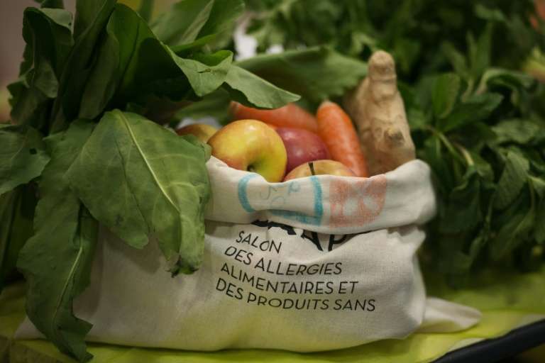 - © 2016 AFP | Crée le 09.04.2016 à 18h08 | Mis à jour le 09.04.2016 à 18h10ImprimerUn sac de fruits présenté le 8 avril 2016 au "Salon des allergies alimentaires et des produits sans" porte de Versailles à Paris Elliott VERDIER-AFP