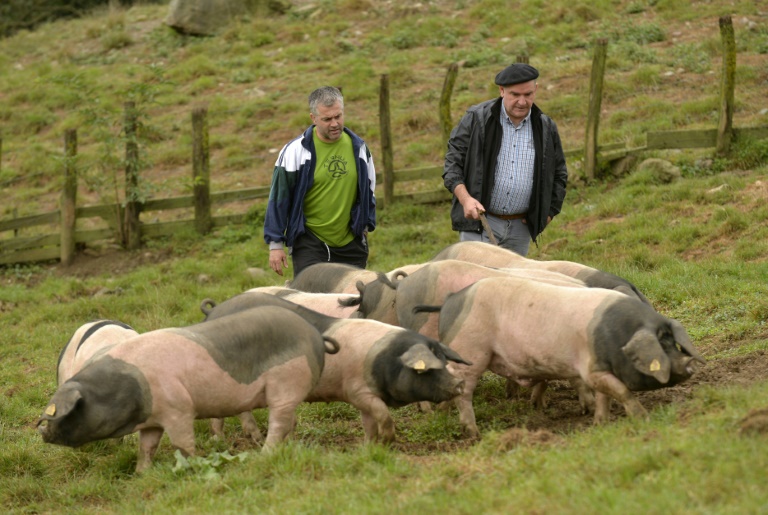 - © 2016 AFP | Crée le 16.10.2016 à 06h03 | Mis à jour le 16.10.2016 à 06h05ImprimerLes fermiers Pierre Oteiza (d) et Michel Ocafrain dans un pré avec leur cochons noirs, à Banca dans la vallée des Aldudes le 19 septembre 2016
