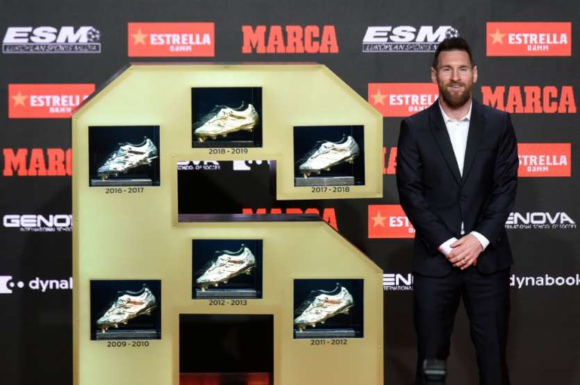 - © 2019 AFP | Crée le 17.10.2019 à 01h16 | Mis à jour le 17.10.2019 à 01h20ImprimerLe capitaine du Barça Lionel Messi pose avec ses six souliers d'or européens, le 16 octobre 2019 à Barcelone Josep LAGO-AFP