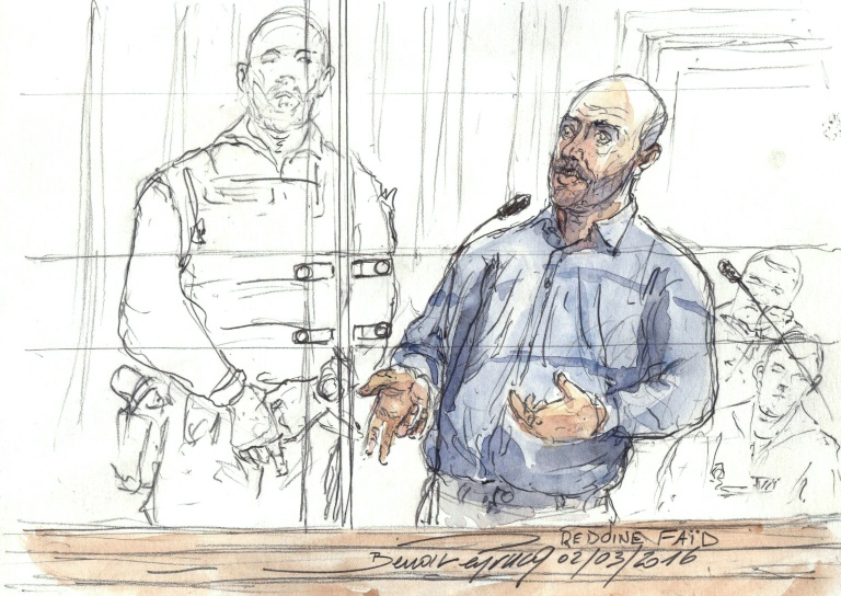 - © 2016 AFP | Crée le 14.04.2016 à 15h35 | Mis à jour le 14.04.2016 à 15h40ImprimerCroquis d'audience du braqueur multirécidiviste Redoine Faïd, devant la cour d'assises de Paris, le 2 mars 2016 BENOIT PEYRUCQ-AFP/Archives