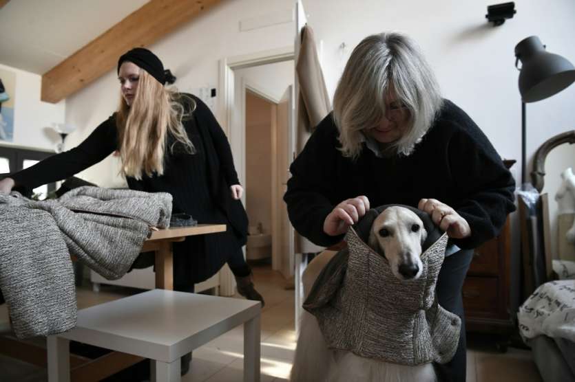 - © 2018 AFP | Crée le 04.01.2018 à 19h00 | Mis à jour le 04.01.2018 à 19h05ImprimerLa conceptrice italienne Giovanna Temellini fait essayer un vêtement à un chien à Milan, le 5 décembre 2017 MARCO BERTORELLO-AFP/Archives