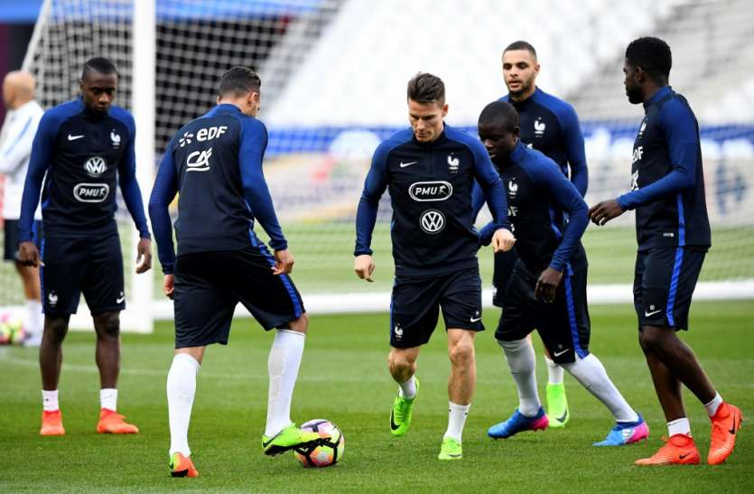 - © 2017 AFP | Crée le 28.03.2017 à 19h15 | Mis à jour le 28.03.2017 à 19h20ImprimerL'équipe de France à l'entraînement au Stade de France, le 27 mars 2017 à la veille de son match contre l'Espagne FRANCK FIFE-AFP