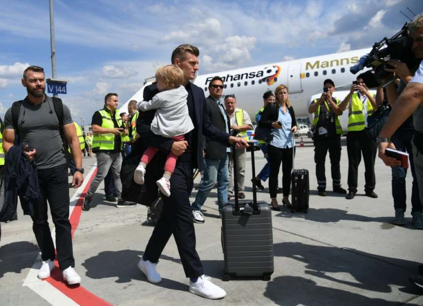 - © 2018 AFP | Crée le 29.06.2018 à 00h59 | Mis à jour le 29.06.2018 à 01h00ImprimerLe milieu de terrain allemand Toni Kroos et sa fille à l'arrivée de la sélection, éliminée du Mondial, à Francfort, le 28 juin 2018 Ina Fassbender-DPA/AFP