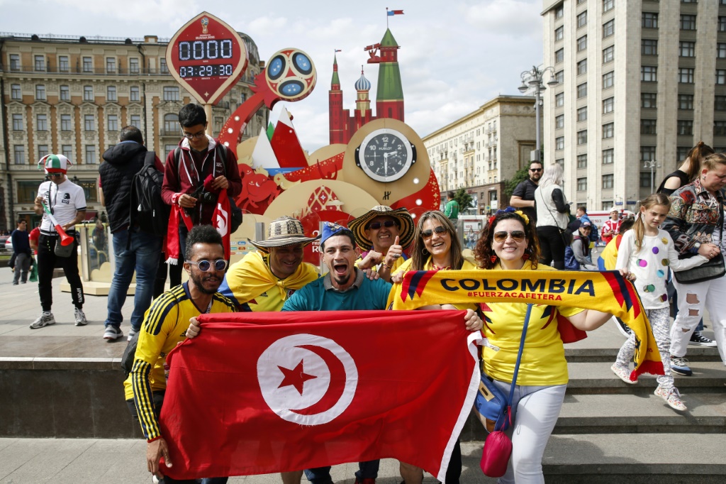 - © 2018 AFP | Crée le 15.06.2018 à 00h21 | Mis à jour le 15.06.2018 à 00h25ImprimerDes supporters de Tunisie et de Colombie dans les rues de Moscou avant le coup d'envoi du Mondial-2018 en Russie Maxim ZMEYEV-AFP