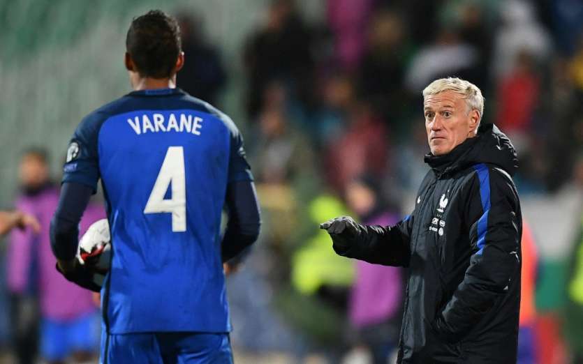 - © 2017 AFP | Crée le 10.10.2017 à 18h53 | Mis à jour le 10.10.2017 à 18h55ImprimerLe sélectionneur des Bleus Didier Deschamps parle avec Raphaël Varane lors du match face à la Bulgarie en qualif pour le Mondial-2018, le 7 octobre 2017 à Sofia FRANCK FIFE-AFP/Archives