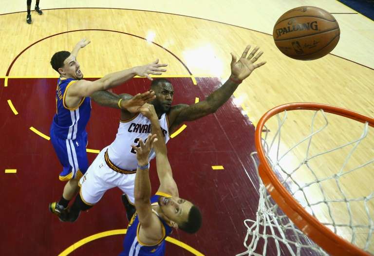 - © 2016 AFP | Crée le 09.06.2016 à 19h22 | Mis à jour le 09.06.2016 à 19h25ImprimerL'ailier des Cleveland Cavaliers Lebron James (c) shoote entre les deux stars de Golden State Stephen Curry (d) et Klay Thompson (g) lors de la victoire de son équipe contre les Wariors dans le 3e match des Finales NBA
