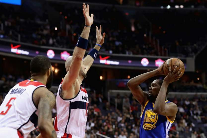 - © 2017 AFP | Crée le 02.03.2017 à 02h35 | Mis à jour le 02.03.2017 à 02h40ImprimerLa star des Golden State Warriors Kevin Durant (d) lors d'un match contre les Wizards à Washington, le 28 février 2017 Rob Carr-GETTY/AFP