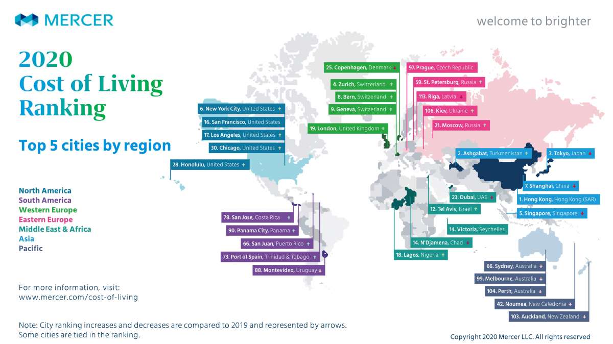 Comme tous les ans, Mercer, courtier spécialisé dans le conseil et les services en ressources humaines, santé et prévoyance, vient de publier le classement 2020 de son étude sur le coût de la vie de l'étude pour les expatriés. Mercer a mesuré les coûts comparatifs de plus de 200 articles dans 209 villes situées sur les cinq continents. Les données ont été recueillies au mois de mars, note le courtier, qui précise toutefois que « les écarts de prix dans de nombreux endroits n'étaient pas significatifs en raison de la pandémie ».