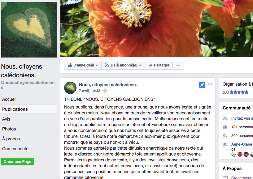 - | Crée le 01.05.2018 à 19h05 | Mis à jour le 02.05.2018 à 18h43ImprimerCapture écran de la page Facebook « Nous, Calédoniens ».