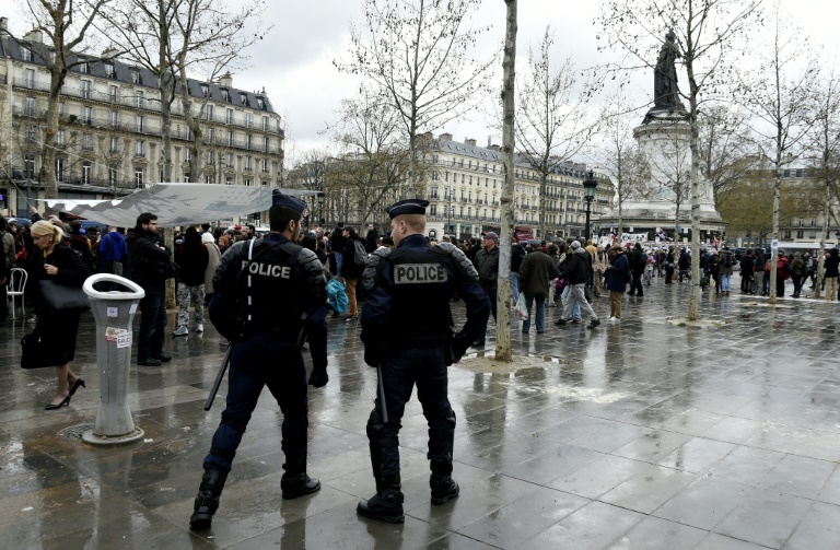 - © 2016 AFP | Crée le 12.04.2016 à 04h11 | Mis à jour le 12.04.2016 à 04h15ImprimerDes policiers regardent quelques centaines de personnes se rassemblaient place de la République pour une assemblée générale du mouvement "Nuit debout", à Paris le 11 avril 2016 DOMINIQUE FAGET-AFP