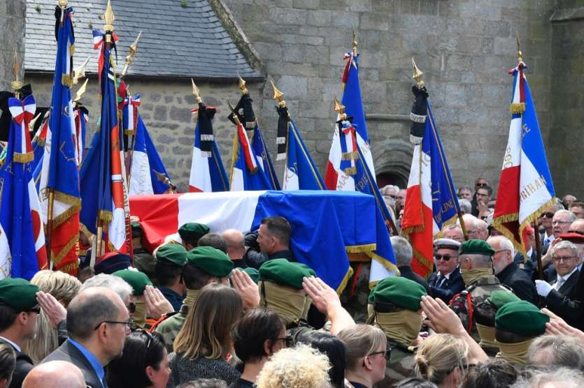 Environ 500 personnes, dont de nombreux "bérets verts", se sont rassemblées sous le soleil sur le parvis de la petite église du XVe siècle de cette ville balnéaire de 8.000 habitants qui jouxte Lorient. Les cloches ont sonné à 14H15 et le corbillard est arrivé quelques minutes après.
