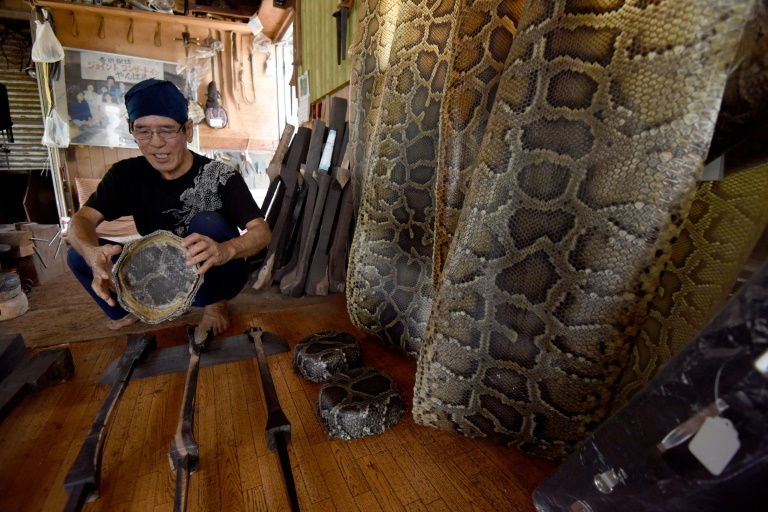 Des peaux de python sèchent sous la chaleur brûlante de l'été dans l'atelier où Seibun Nakamine façonne une pièce de l'identité musicale d'Okinawa.
