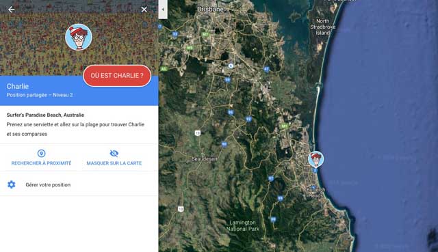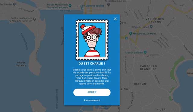 Depuis ce dimanche 1er avril, Google Maps vous propose de partir à la recherche de Charlie (le célèbre personnage au bonnet et au pull rayé blanc et rouge, créé par Martin Handford) et de sa bande de copains ; son amie Félicie, son chief Ouaf, son double maléfique Pouah et le magicien Blanchebarbe. De manière aléatoire, le service de cartographie en ligne de Google dissimule ces personnages aux quatre coins du monde. Une aventure qui débute par la cordillère des Andes et dont la difficulté augmente à chaque niveau…