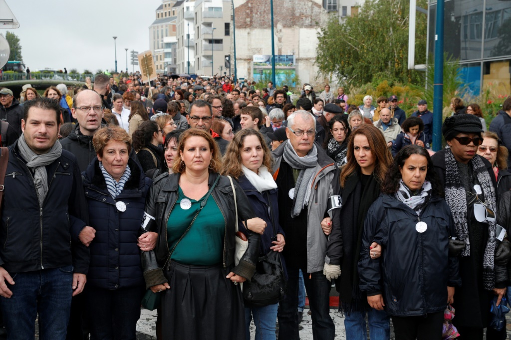 En tête de cette marche silencieuse, des proches de Christine Renon et des directrices et directeurs d'école de Pantin avançaient en se tenant le bras. Beaucoup portaient un brassard noir.
