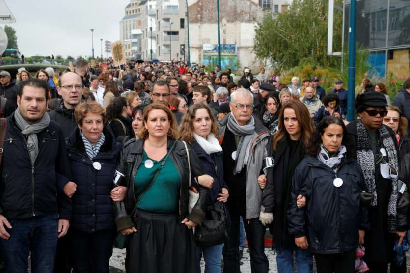 Derrière eux, des enseignants et des parents d'élèves, certains venus avec leurs enfants. Sur une pancarte, une femme, un bouquet de roses blanches autour du cou, a inscrit: "mourir pour ses idées, mourir de trop aimer. Je suis Christine".