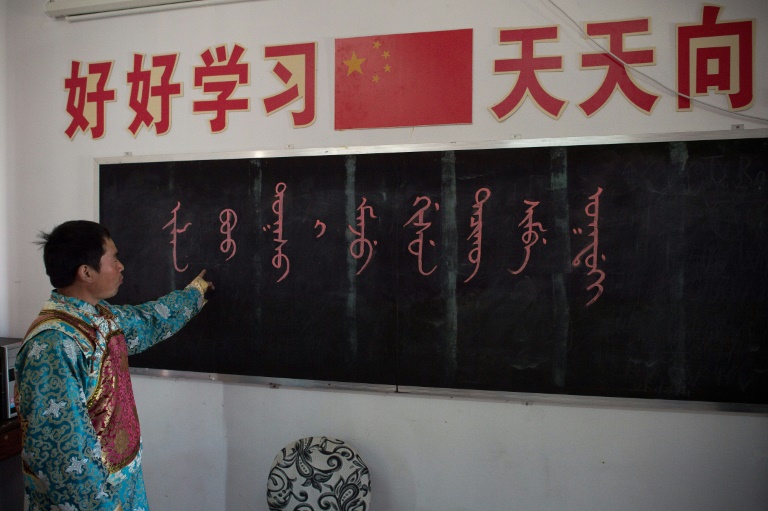 Dans une salle de classe, des enfants attentifs égrènent en choeur les lettres de l'alphabet mandchou, puis les mots pour "parapluie" et "vache".