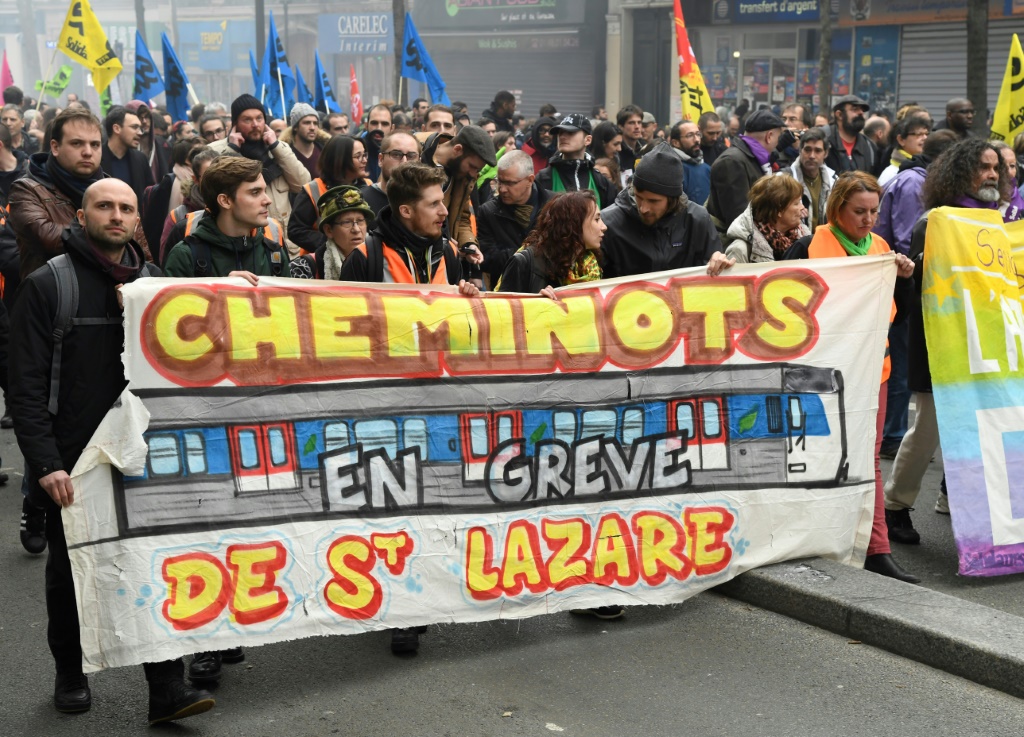 - © 2018 AFP | Crée le 04.04.2018 à 01h42 | Mis à jour le 04.04.2018 à 01h45ImprimerDes cheminots de Saint-Lazare manifestent à Paris, mardi 3 avril 2018 BERTRAND GUAY-AFP