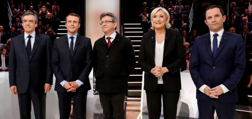 - © 2017 AFP | Crée le 21.03.2017 à 07h53 | Mis à jour le 21.03.2017 à 07h55ImprimerLe premier débat télévisé entre les principaux candidats à la présidentielle Francois Fillon, Emmanuel Macron, Jean-Luc Melenchon, Marine Le Pen, Benoit Hamon, le 20 mars à Aubervilliers Patrick KOVARIK-POOL/AFP