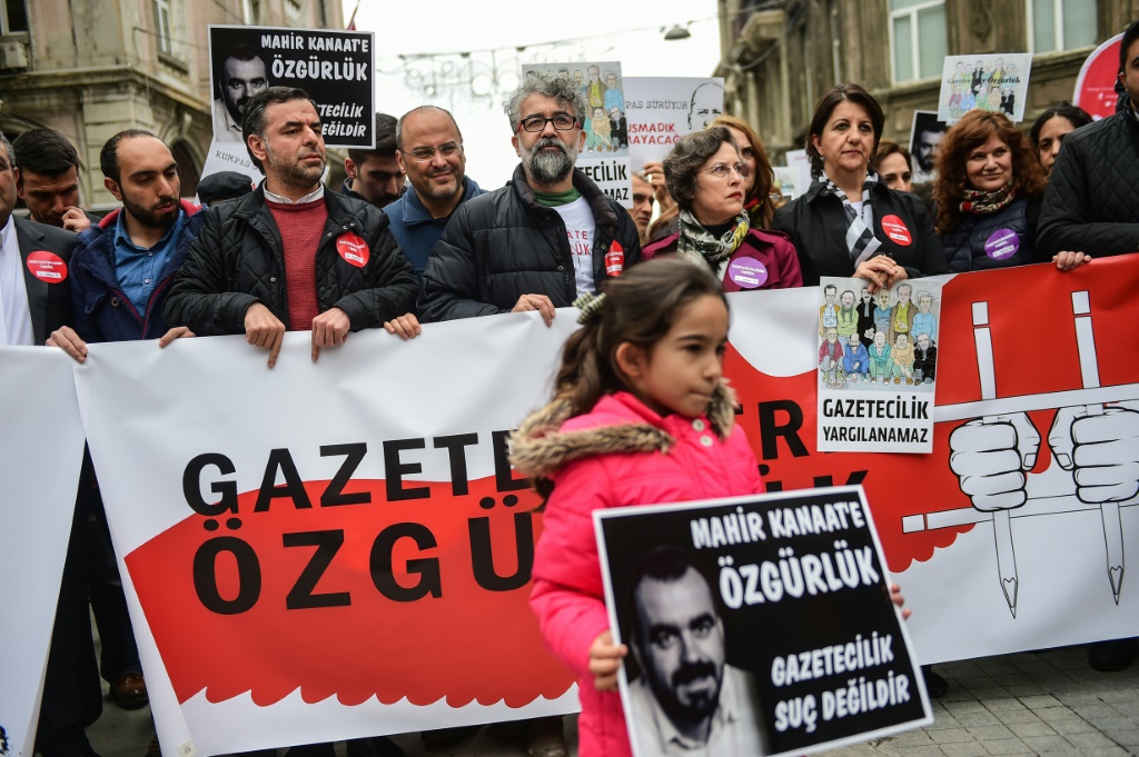 - © 2017 AFP | Crée le 26.04.2017 à 15h09 | Mis à jour le 26.04.2017 à 15h10ImprimerManifestation pour la liberté de la presse et pour demander la libération de journalistes emprisonnés en Turquie, le 9 avril 2017 à Istanbul YASIN AKGUL-AFP