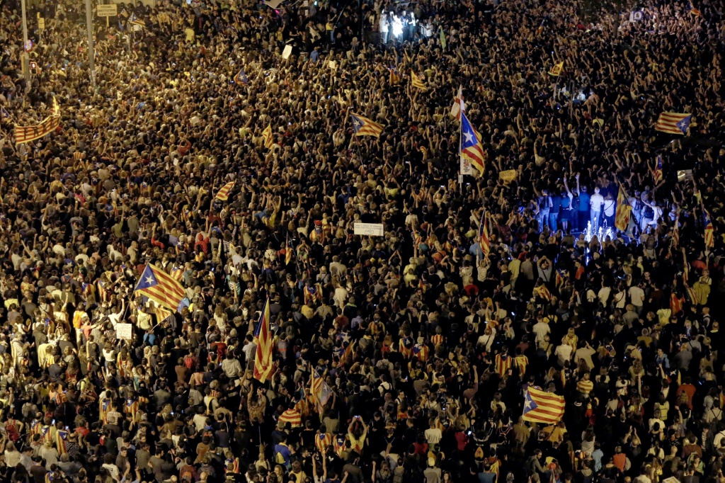 - © 2017 AFP | Crée le 22.09.2017 à 06h14 | Mis à jour le 22.09.2017 à 06h20ImprimerDes manifestants brandissent des drapeaux catalans à Barcelone le 20 septembre 2017 PAU BARRENA-AFP