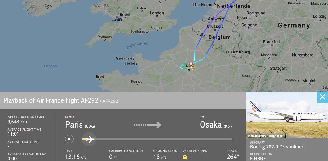 Le Boeing 787-9 Dreamliner d'Air France avait décollé de Roissy-Charles de Gaulle à 13h30 pour l'aéroport d'Osaka Kansai où il devait atterrir ce lundi matin à 8h20, heures locales. Mais l'avion a été contraint à faire demi-tour à 14h45 alors qu'il se trouvait dans l'espace aérien danois, à 80 km environ au sud-est de Copenhague, pour se poser à Paris à 16h10.