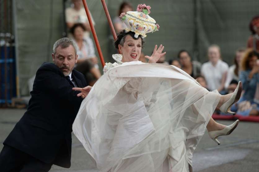Dans une "cohérence incohérente", sa mise en scène alterne saynètes graves et humoristiques et convoque tour à tour un légionnaire romain sorti d'un frigidaire, un plombier-scaphandrier la tête coincée dans le tambour d'une machine à laver, un chef de gare cerclé d'un train électrique ou une machine à écrire frappant les touches toute seule.