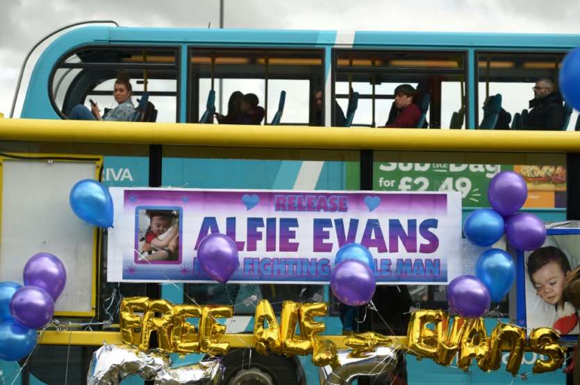 - © 2018 AFP | Crée le 28.04.2018 à 18h08 | Mis à jour le 28.04.2018 à 18h10ImprimerDes ballons, un poster sur un bus en soutien à Alfie Evans, un bébé britannique en état semi-végétatif dont les parents s'opposent à l'arrêt des soins, le 26 avril 2018 à Liverpool, dans le nord-ouest de l'Angleterre Oli SCARFF-AFP