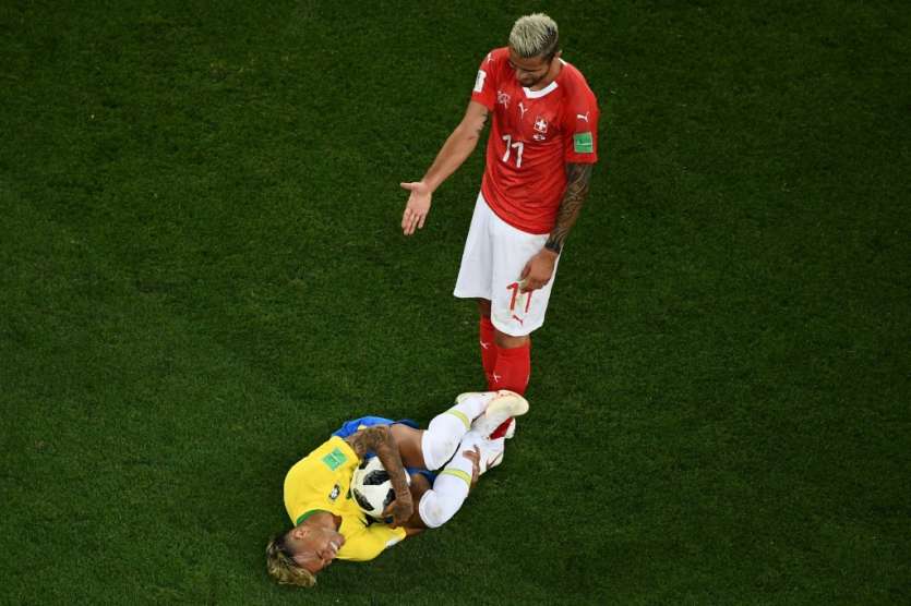 - © 2018 AFP | Crée le 18.06.2018 à 07h34 | Mis à jour le 21.06.2018 à 11h44ImprimerLe Brésilien Neymar au sol sous les yeux du Suisse Valon Behrami, agacé, lors du Mondial, le 17 juin 2018 à Rostov Jewel SAMAD-AFP