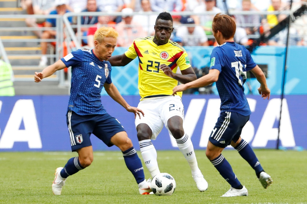 - © 2018 AFP | Crée le 20.06.2018 à 01h02 | Mis à jour le 21.06.2018 à 09h43ImprimerLe défenseur de la Colombie, Davinson Sanchez (au c.) entouré des Japonais Yuto Nagatomo et Takashi Inui lors de la Coupe du Monde 2018 à Saransk le 19 juin 2018 Jack GUEZ-AFP