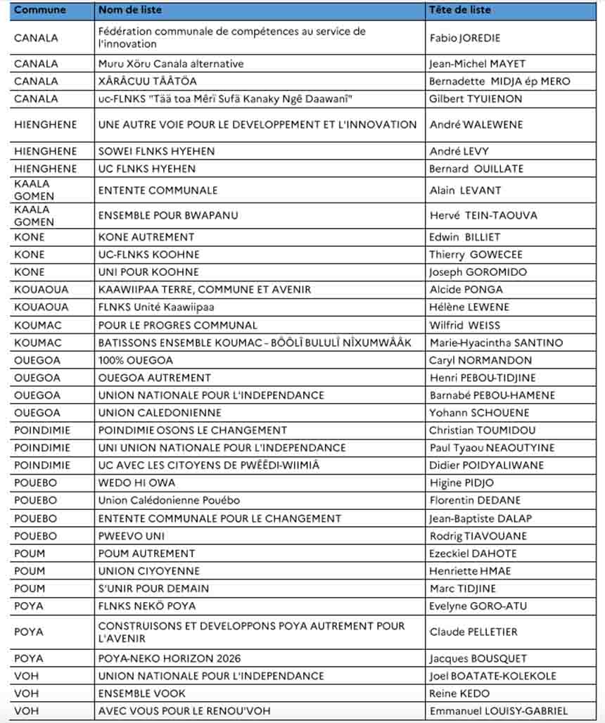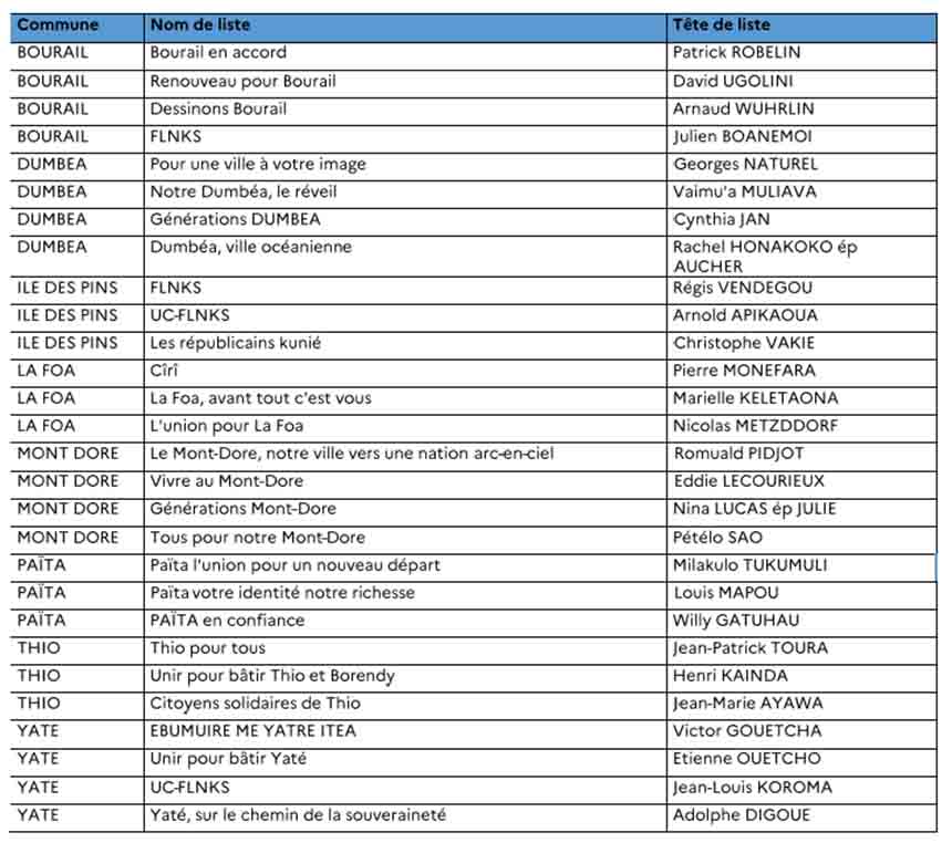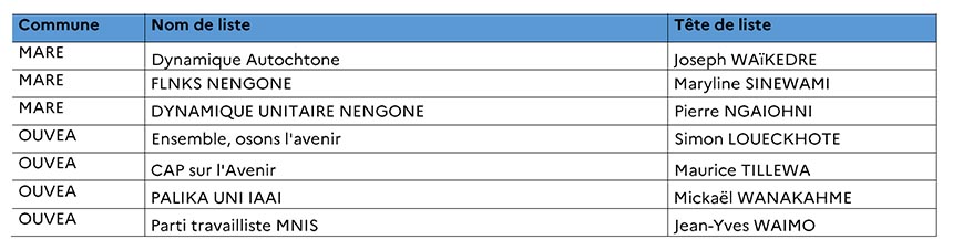 7 listes ont été déposées en province des îles Loyauté, 36 listes en province Nord et 28 listes en Province Sud.