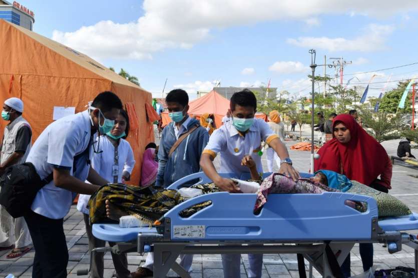 - © 2018 AFP | Crée le 06.08.2018 à 16h08 | Mis à jour le 06.08.2018 à 16h10ImprimerDes équipes médicales prennent en charge des blessés dans un hôpital de fortune, le 6 août 2018 à Mataram, après un séisme meurtrier sur l'île de Lombok, en Indonésie ADEK BERRY-AFP
